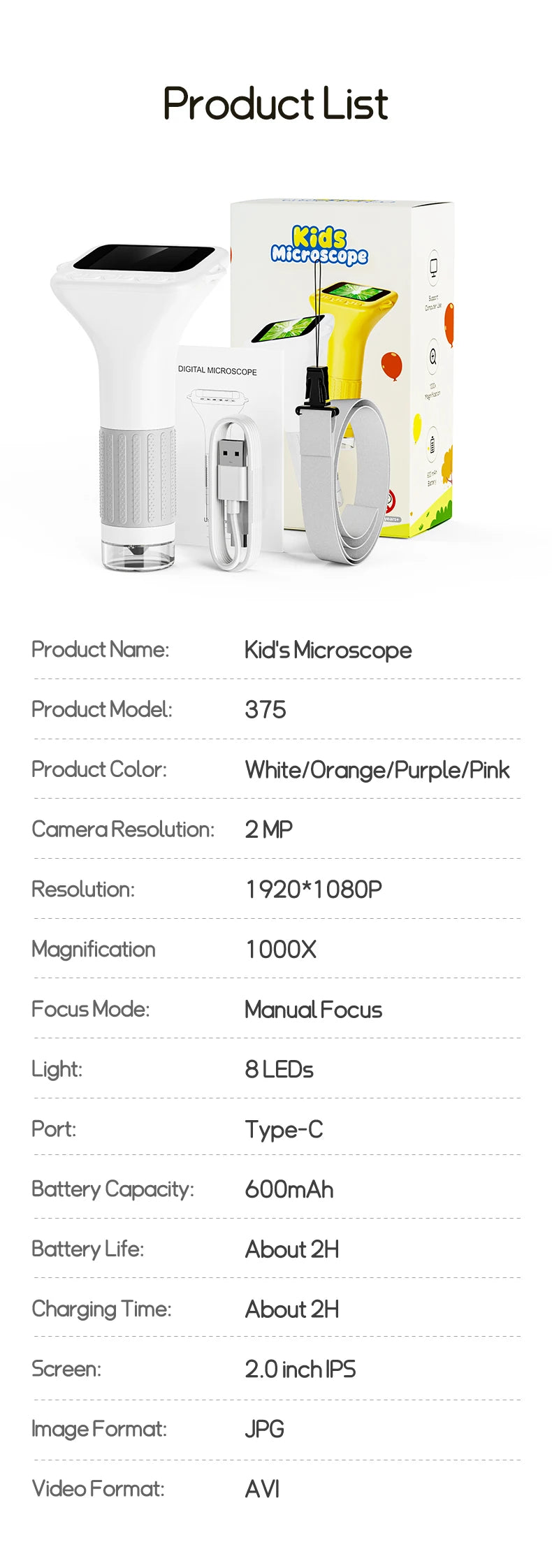 1000x Digital Microscope For Kids 2-Inch IPS Screen 2MP Optical Lens With Camera And Video Function for Christmas Birthday Gift