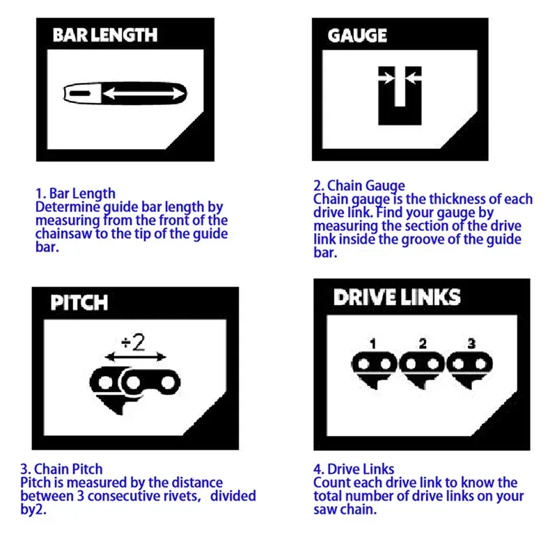 And this chain length size is not the only parameter to measure whether the chain is suitable for your chainsaw, there are several more important parameters that need to be matched, such as: Pitch, Chain gauge, Drive Links, cutter, these 4 parameters are the decision Reasons for whether it is right for your chainsaw.