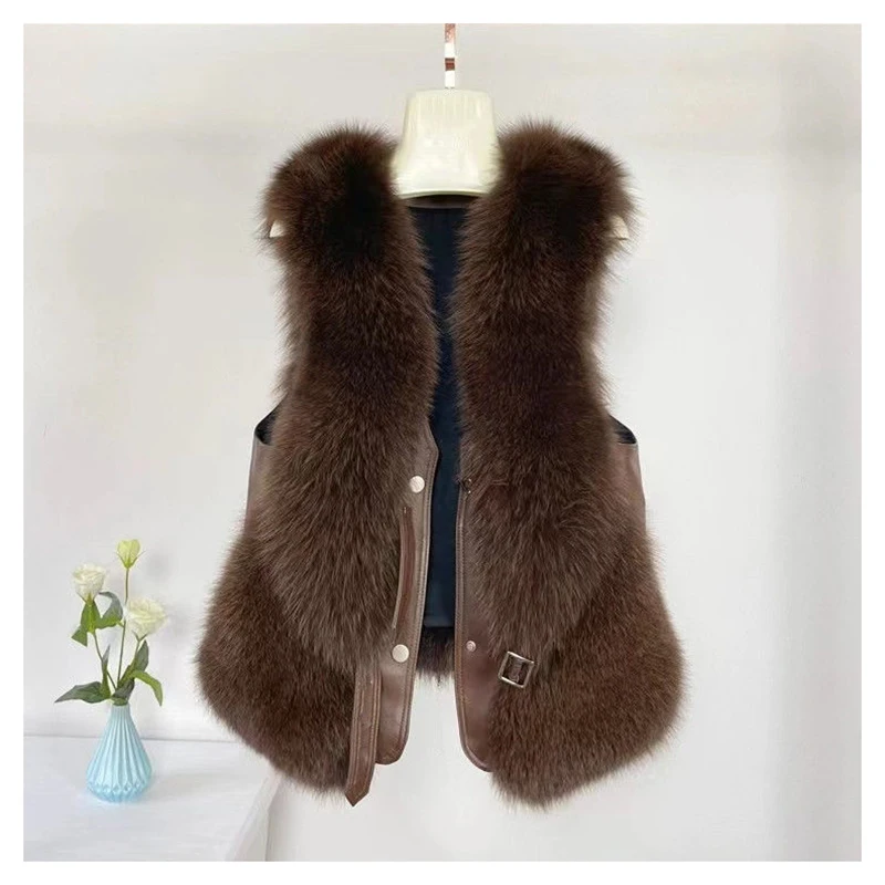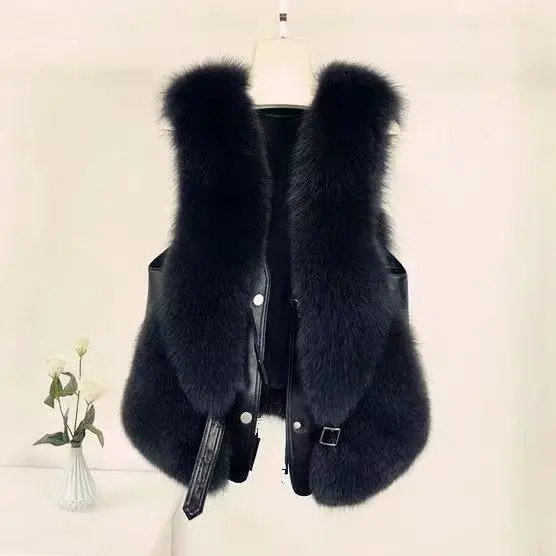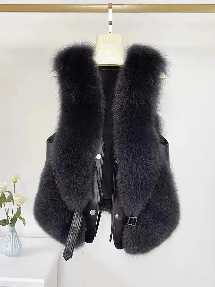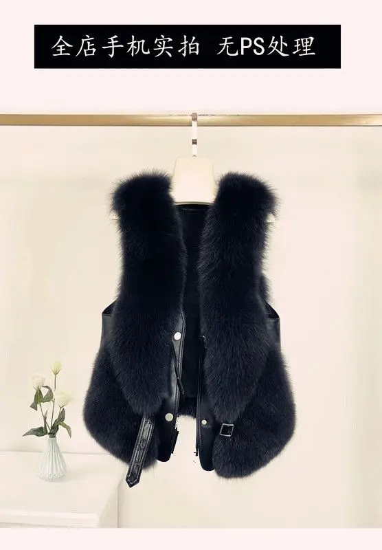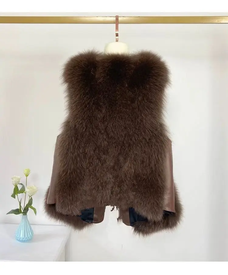2024 autumn and winter fur vest short spliced leather, new style with shoulder collar and gold short sobretudo feminino