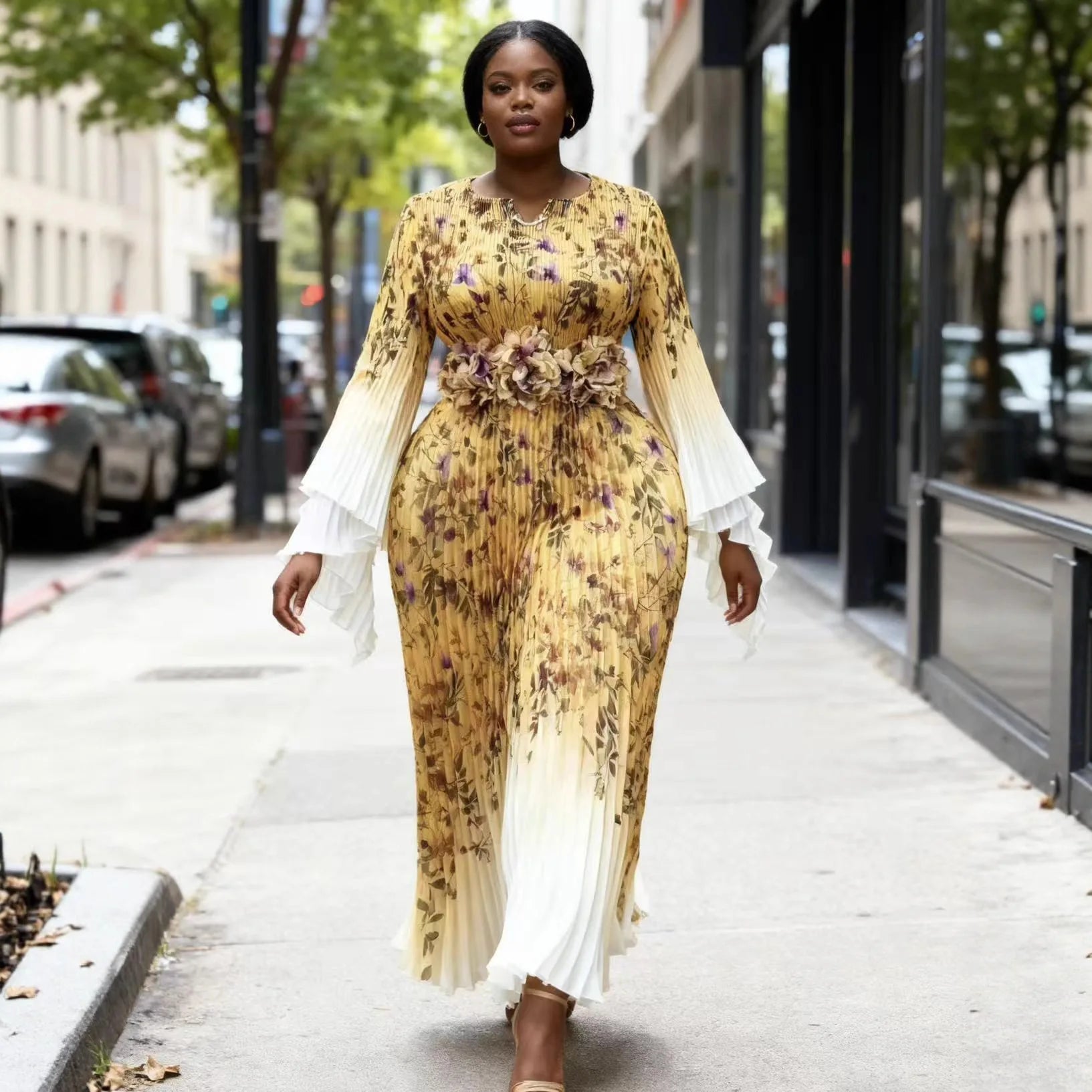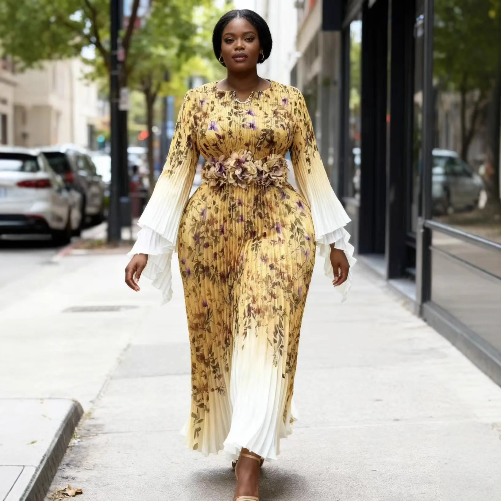 2025 One Size Temperament Women's Miyake Pleated Printed Long Sleeve Dress Loose Clothing Casual Pleated Dress