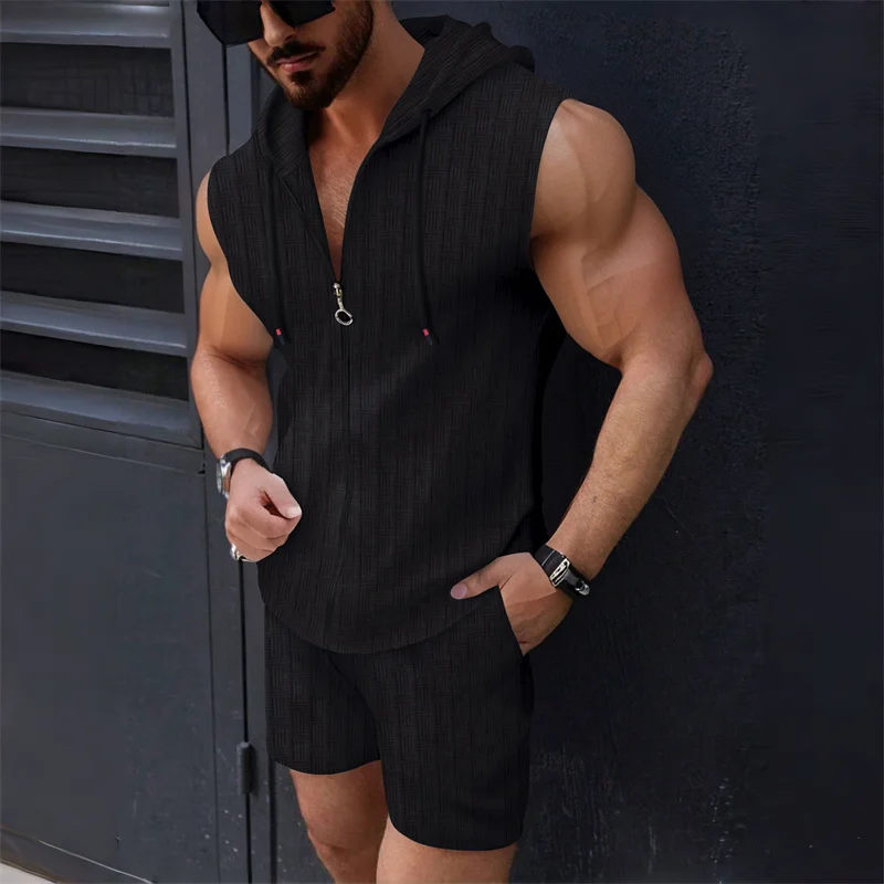 5 colors available for men's hooded sleeveless zipper plaid suit Slim fashion casual sports vest shorts two-piece set trendy top