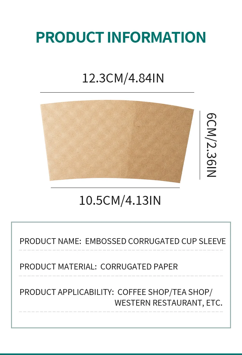 Heat and cold resistance: The paper coffee cup sleeve can effectively insulate your hands from heat and freezing. It is very suitable for hot coffee and hot chocolate, and can also be used in soda water, juice, tea and ice cream
