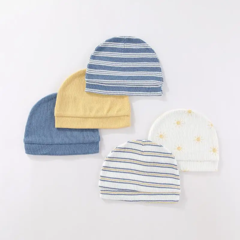 5Pieces Newborn Baby Boy Hats Cartoon Print 100%Cotton Baby Girls Hats 0-6Months Soft Solid Color Infant Accessories