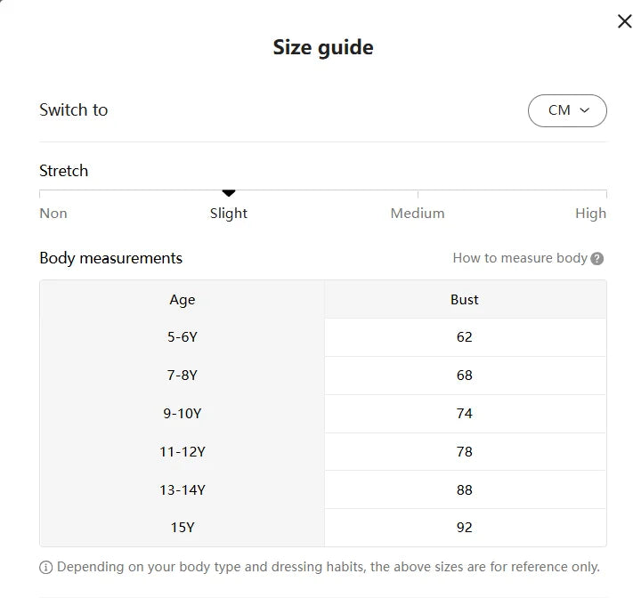 size_info: {"sizeInfoList":[{"length":{"cm":"75","inch":"29.53"},"size":"5-6Y","vid":-1},{"length":{"cm":"80","inch":"31.50"},"size":"7-8Y","vid":-2},{"length":{"cm":"86","inch":"33.86"},"size":"9-10Y","vid":-3},{"length":{"cm":"92","inch":"36.22"},"size":"11-12Y","vid":-4},{"length":{"cm":"98","inch":"38.58"},"size":"13-14Y","vid":-5},{"length":{"cm":"104","inch":"40.94"},"size":"15Y","vid":-6}]}