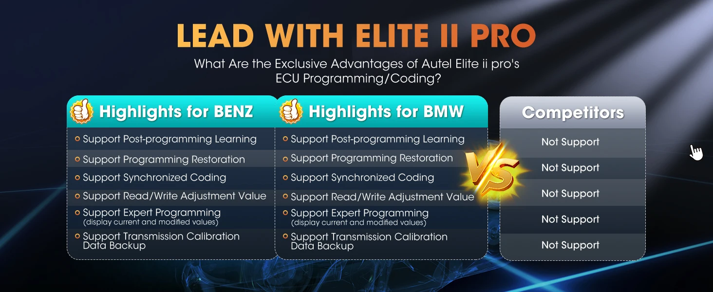 Professional auto scan tool Elite II pro has powerful ECU Coding, allowing you to customize OE-settings, disable annoying features, refresh hidden functions and match/learn/code replaced ECU. Elite 2 Pro also offers high-end online functions, including direct communication with OEM servers and access to online data for fast and complicated repairs, such as online coding for B.MW, Porsche, V-W, Nissan, Infiniti, Hyundai, etc. 👍Moreover, Autel Elite II Pro scanner supports offline adaption for Ford, Mazda, Jaguar, Vaxhall, and Opel.