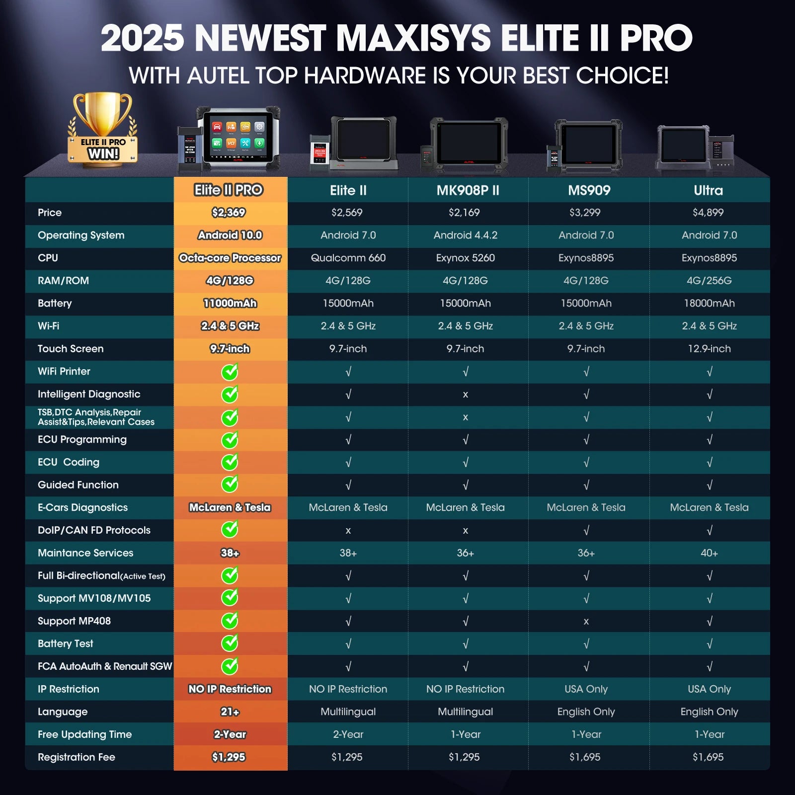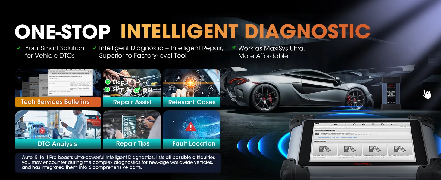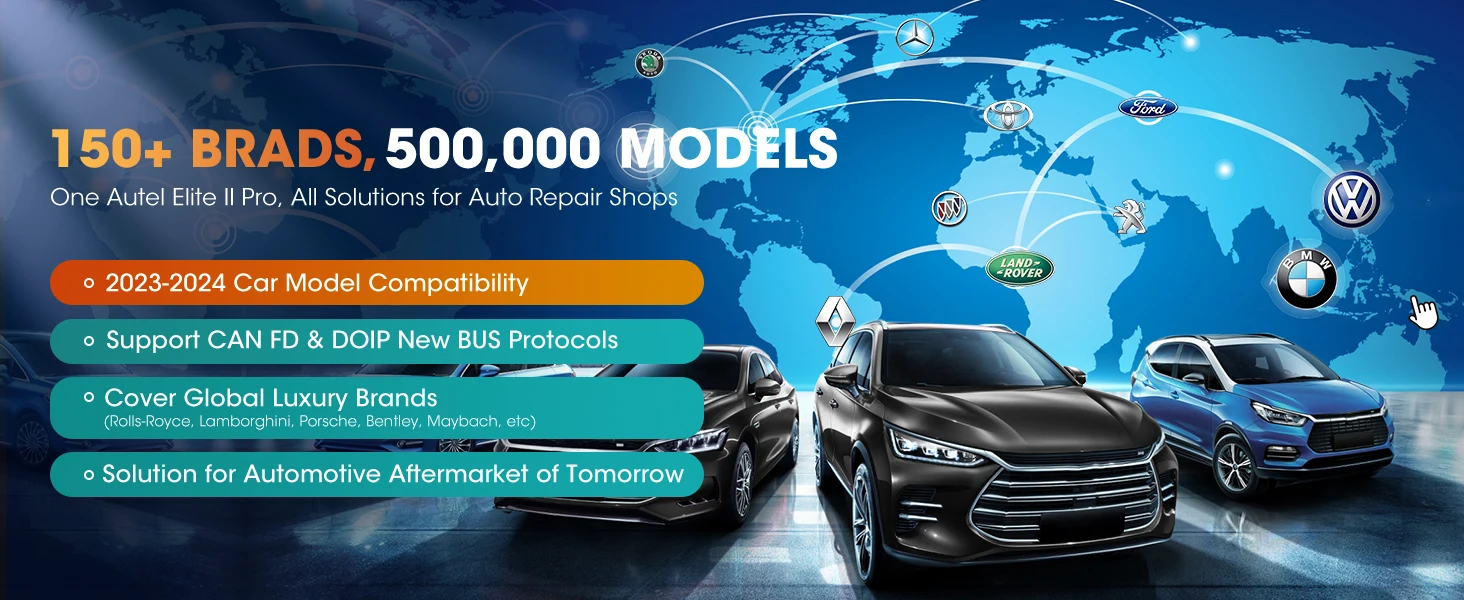 Recommended by millions of mechanics, the Autel MaxiSys Elite II Pro scanner performs same function as Ultra MS909 MS919, but half the cost! ✅All-in-one Intelligent Diagnosis ✅J2534 Programming & Coding✅40+ Services, All system diagnosis✅Auto Scan 2.0(5X faster scanning)✅Active Test✅Refresh Hidden Features & VAG Guided; 👍2025 Newly Added: ✅150+ Brands Including Tesla, McLaren✅FCA SGW & D-PDU/RP1210, DOIP CANFD (MS908S PRO II not support)✅21+Languages, NO IP Limits...Absolutely an ideal solution with even 2 years free updates (2590 Bucks value) - far superior to other scanners!