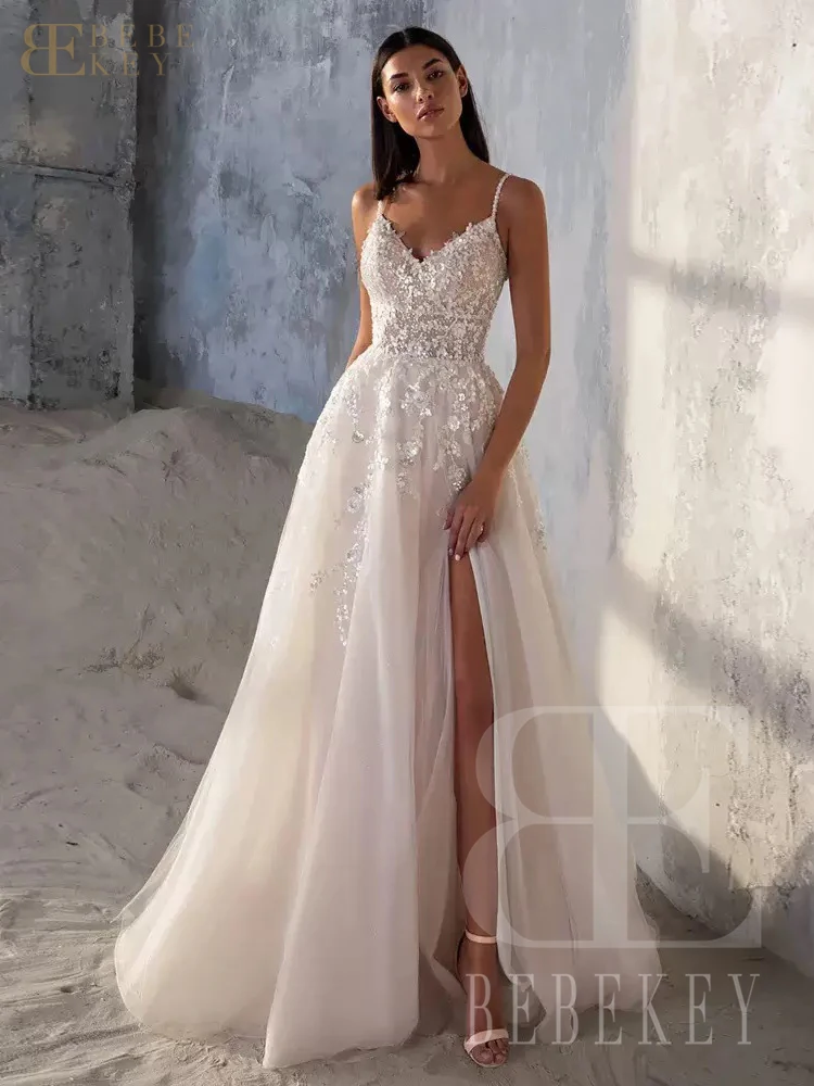 BEBEKEY Bead Sequin Wedding Dresses A-line Lace Appliques Bridal Gown Customized Spaghetti Straps Formal Dress vestidos de novia