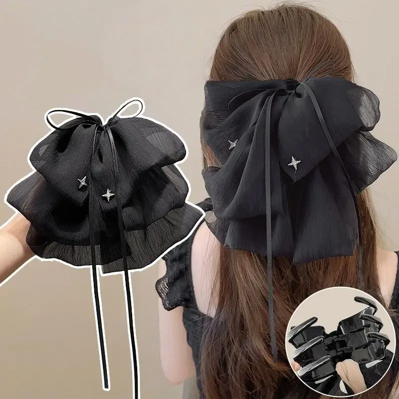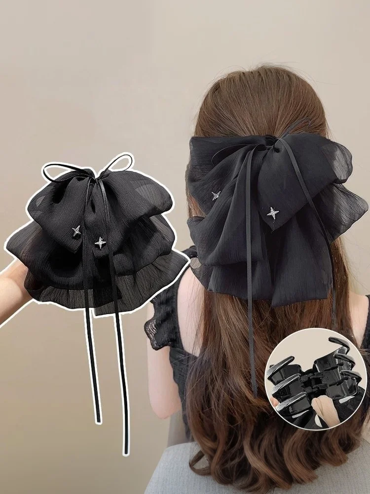 Black Elegant Women Large Bow Hair Claw Temperament Chiffon Big Bowknot Barrettes Hairpin Women Ponytail Hairpin Hair Accessory