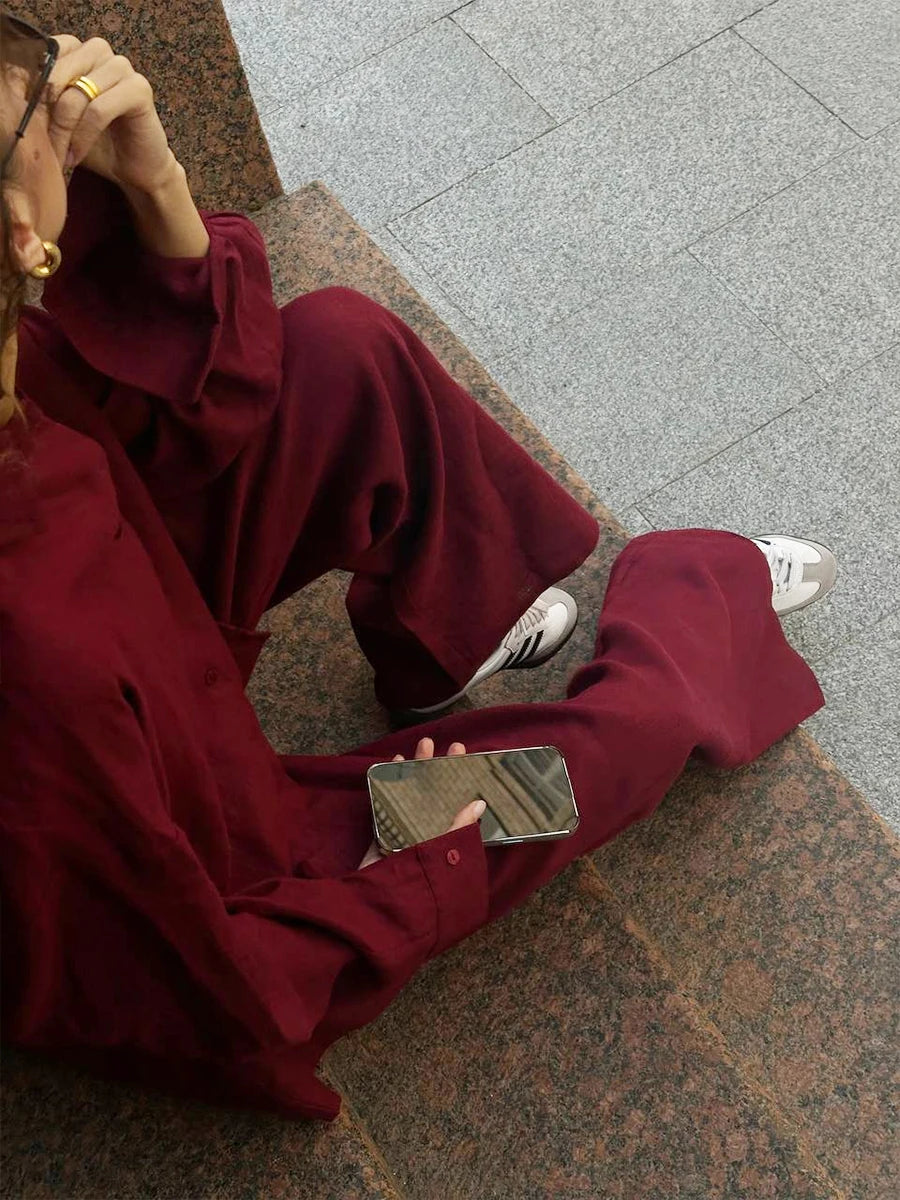 Bornladies Cotton Casual Pants Sets Women's Solid Color Cozy Lapel Long Sleeve Shirt Summer Outfit Elastic Waist Pants Suits