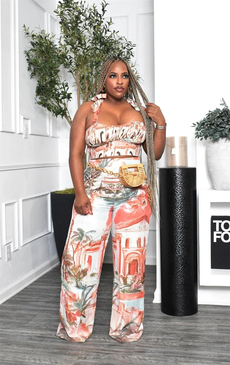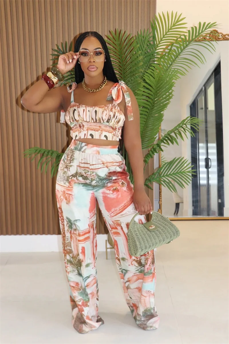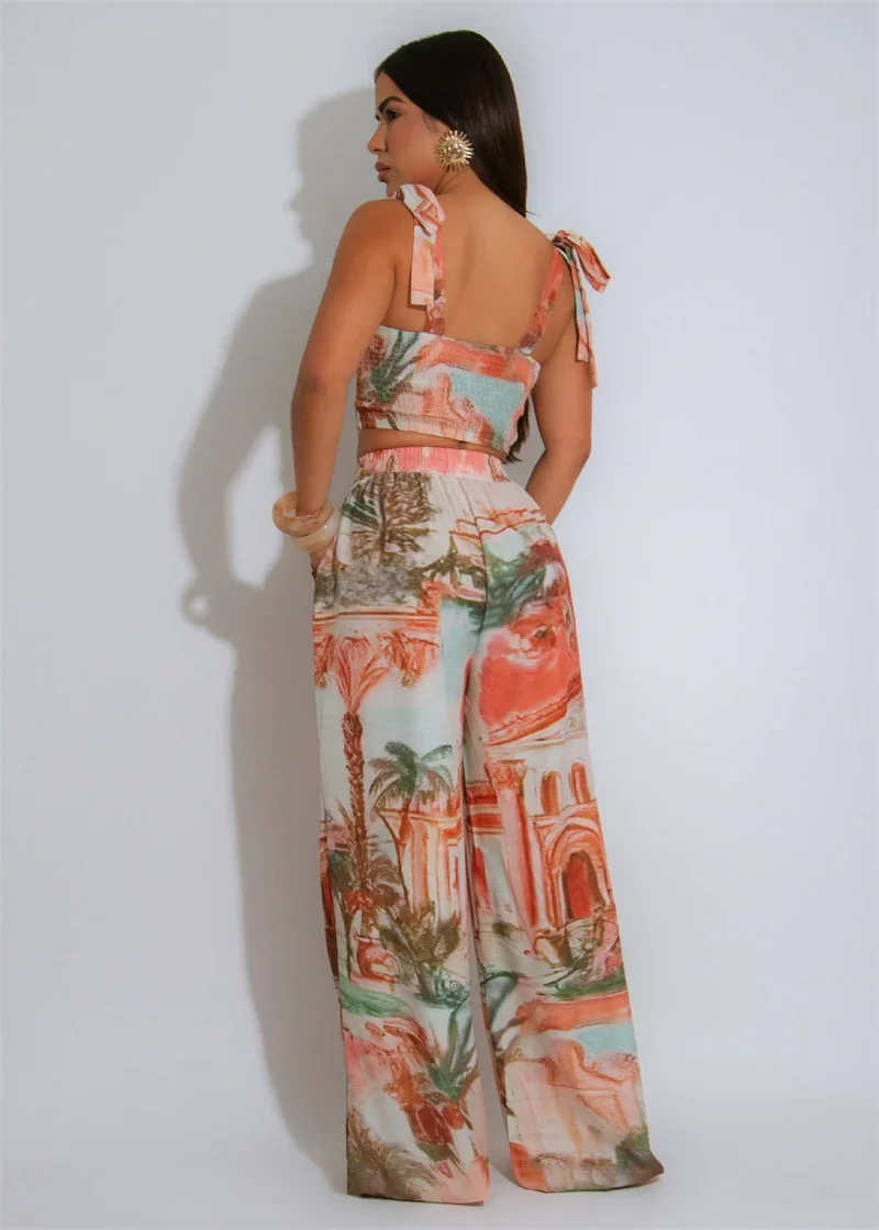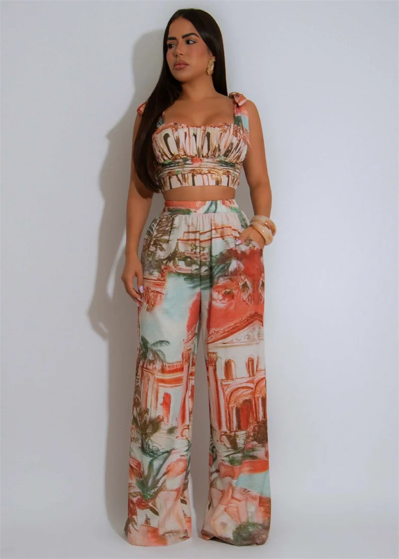 Doyerl Printing Pattern Two Piece Set Woman Holiday Outfits Lace-up Strapless Crop Top and Wide Leg Pants Matching Sets Ensemble