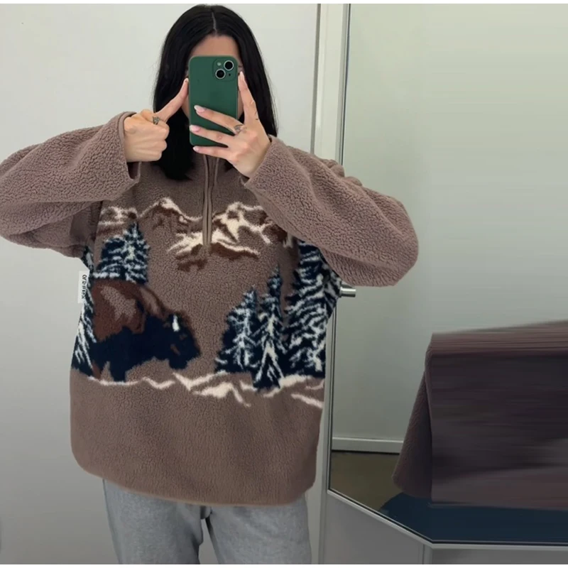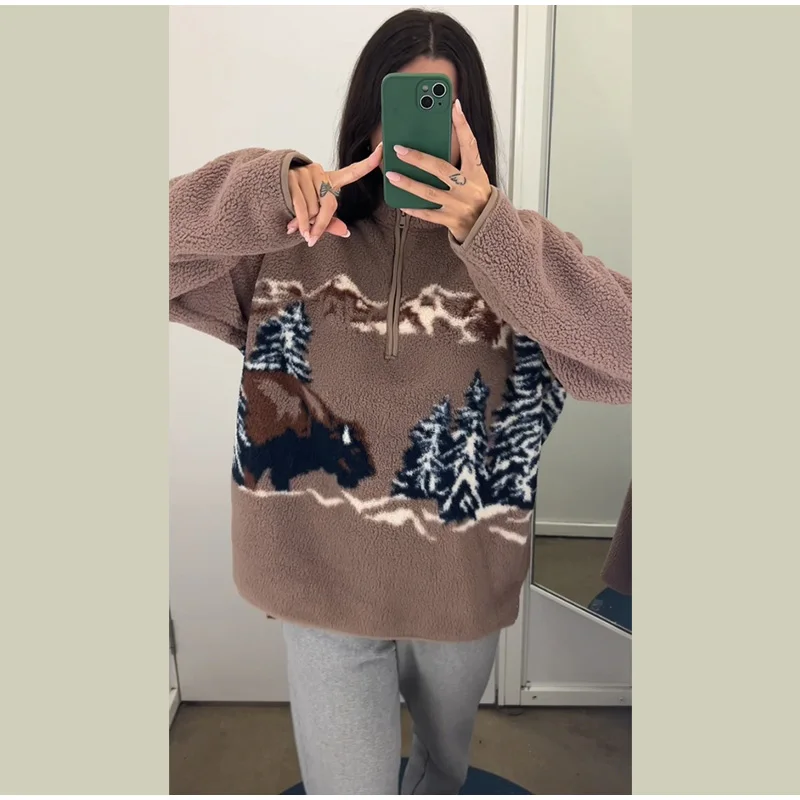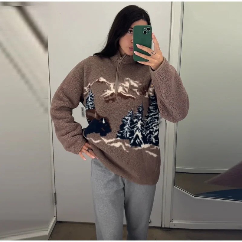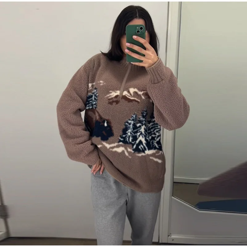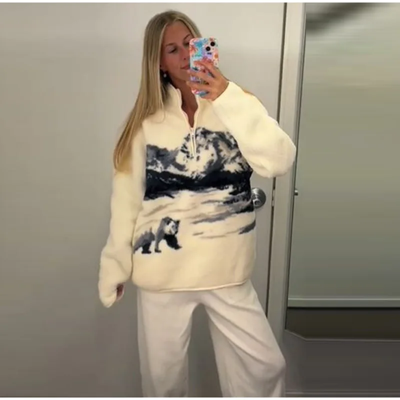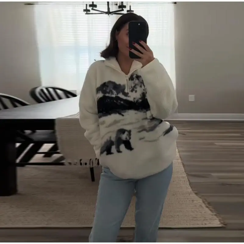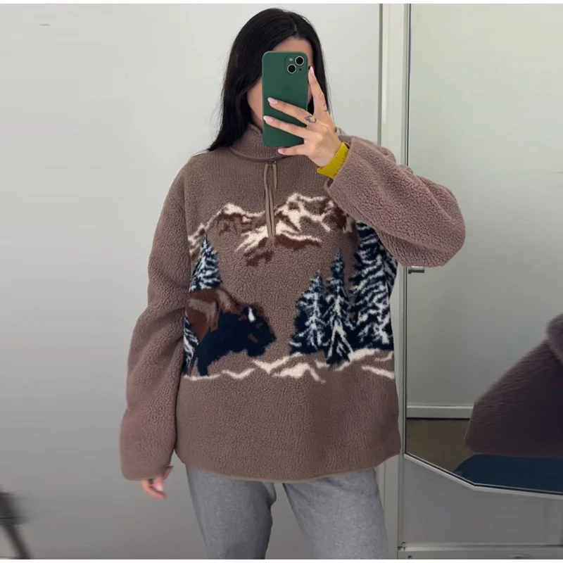 Fashion Printed Sherpa Pullover Women's Loose Long Sleeve Zippers Cozy Style Top 2025 Autumn New Lady Casual Warm Outerwear
