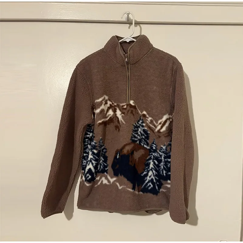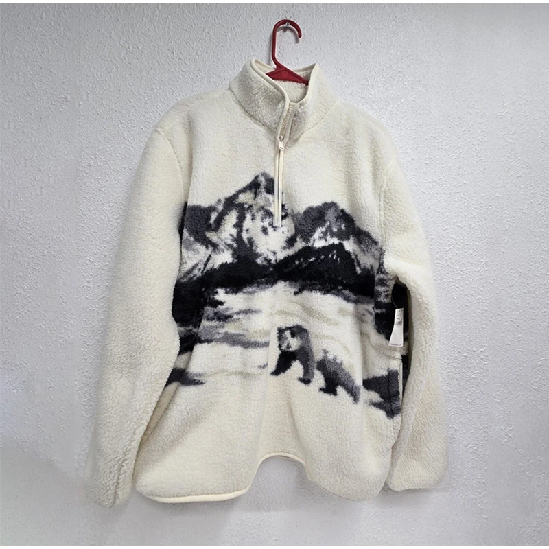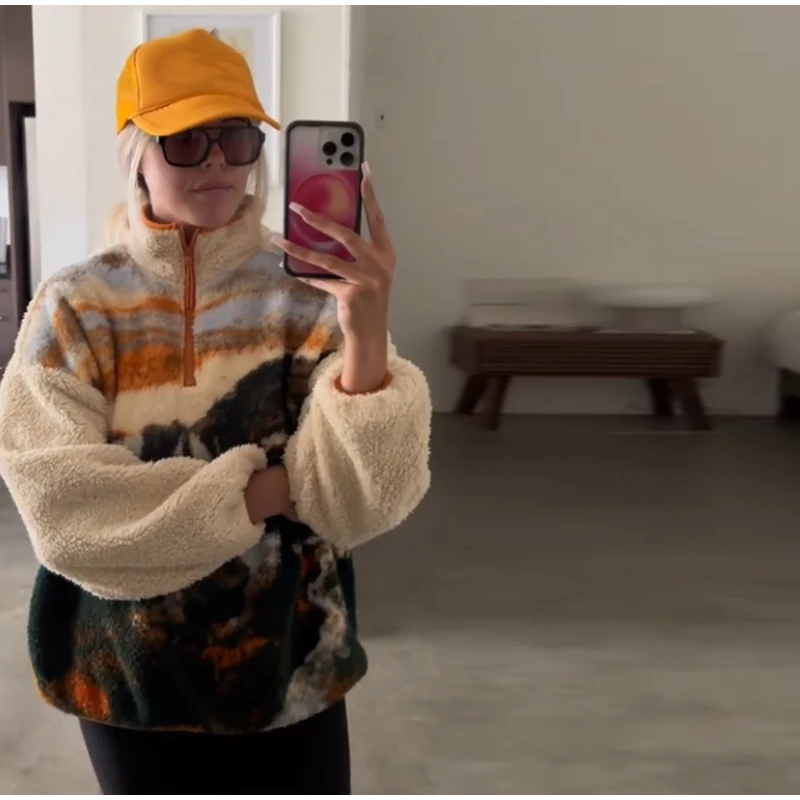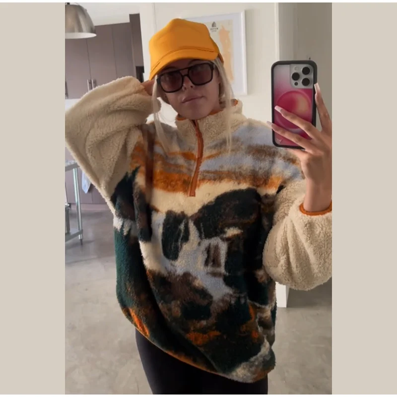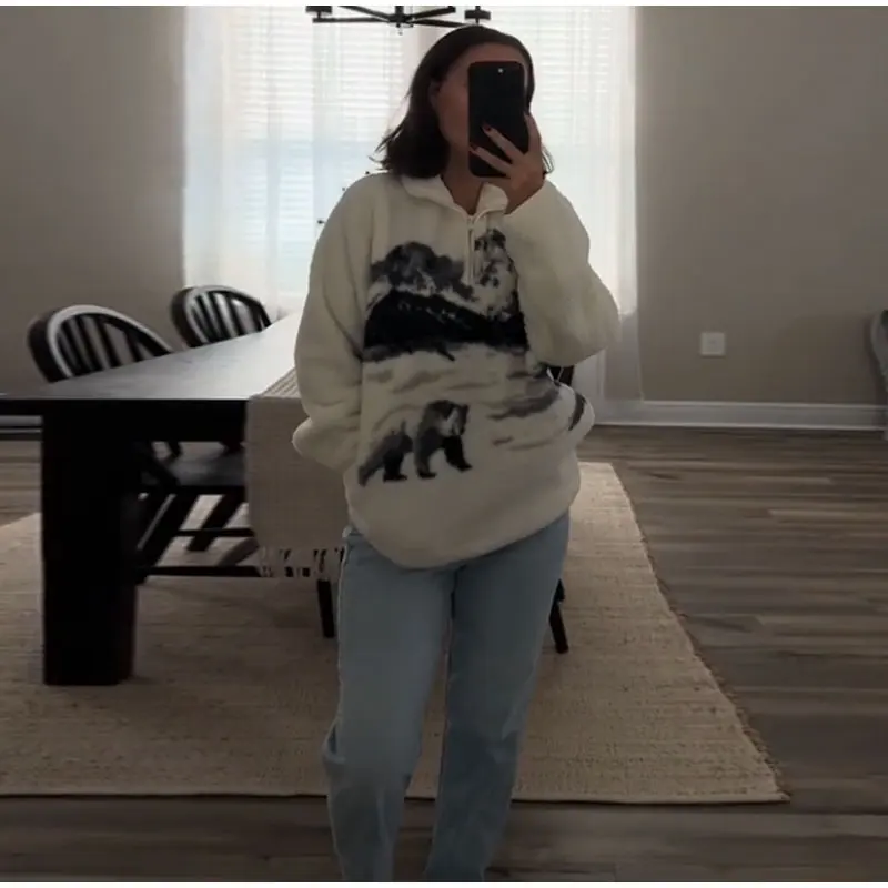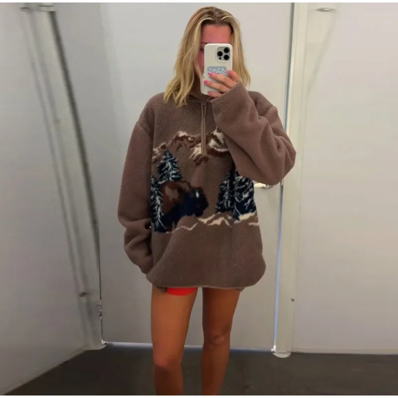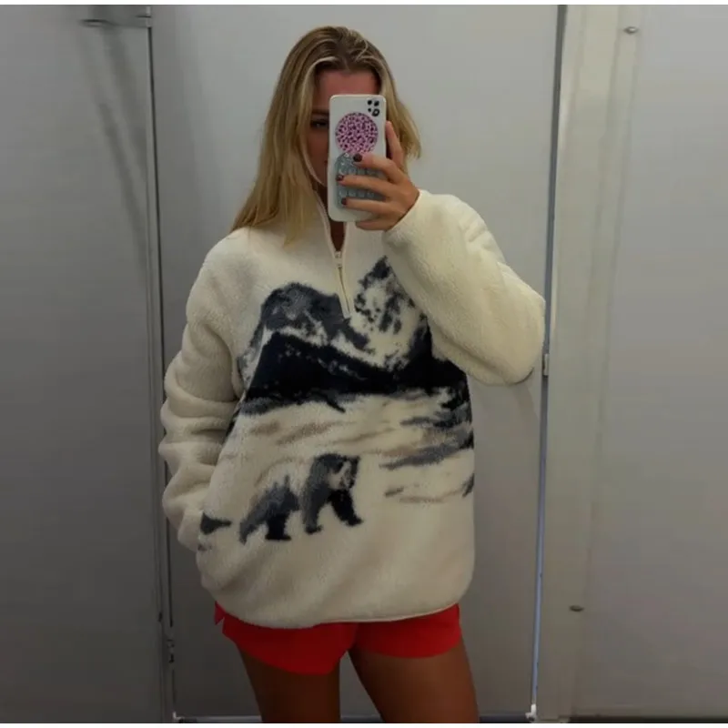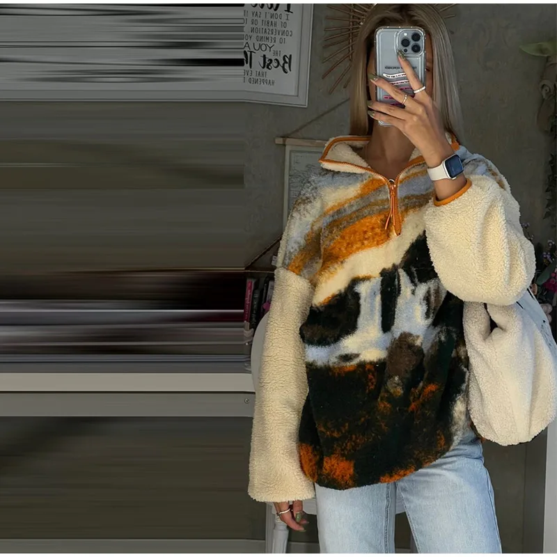 Fashion Printed Sherpa Pullover Women's Loose Long Sleeve Zippers Cozy Style Top 2025 Autumn New Lady Casual Warm Outerwear