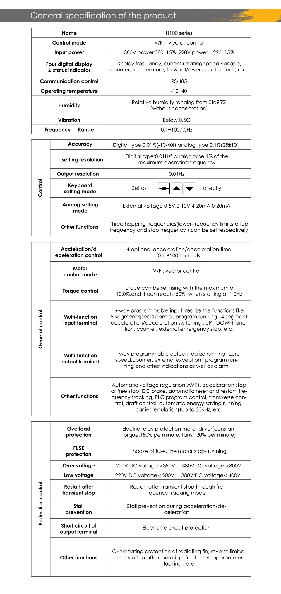 5. Built-in PID setting, speed tracking, multi-function relay output, multiple fault protection, multiple state feedback torque control, analog setting.