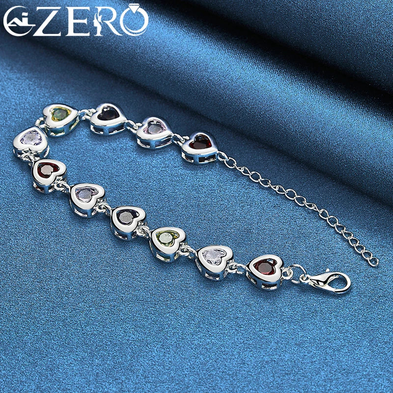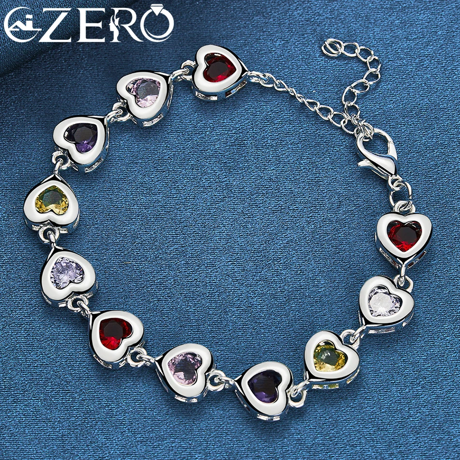 Hot 925 Sterling Silver Heart Multi-Color Crystal Chain Bracelet For Women Fashion Wedding Party Jewelry Valentine'S Day Gift
