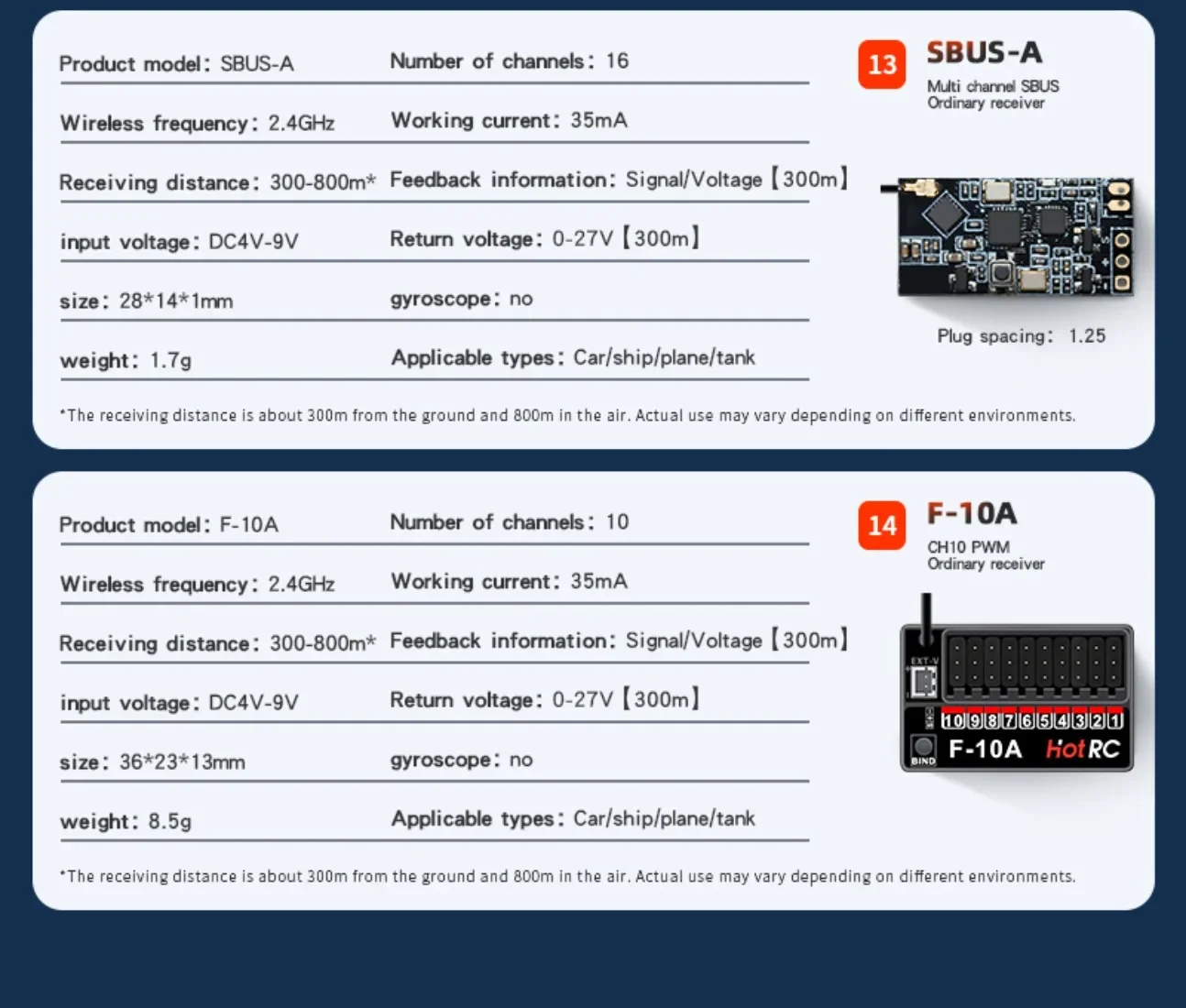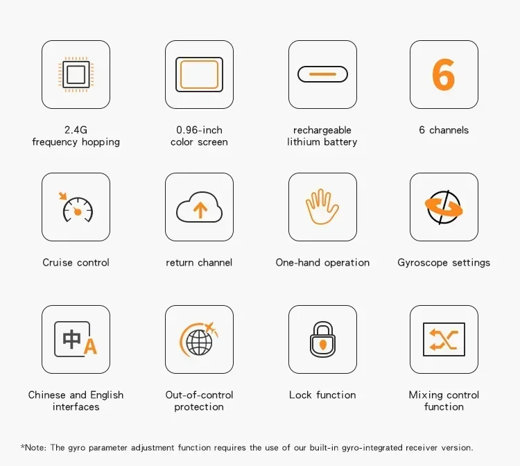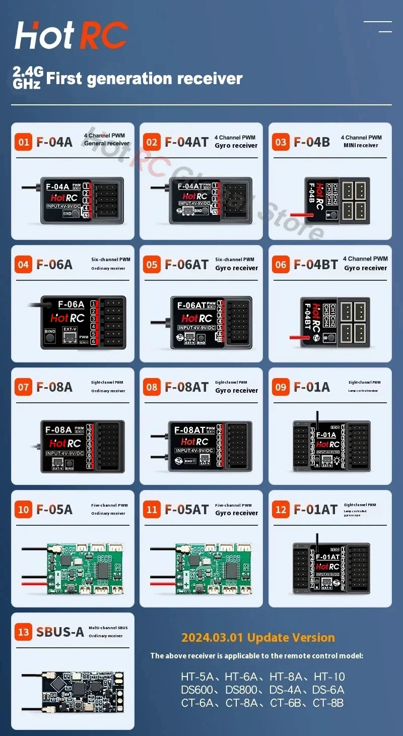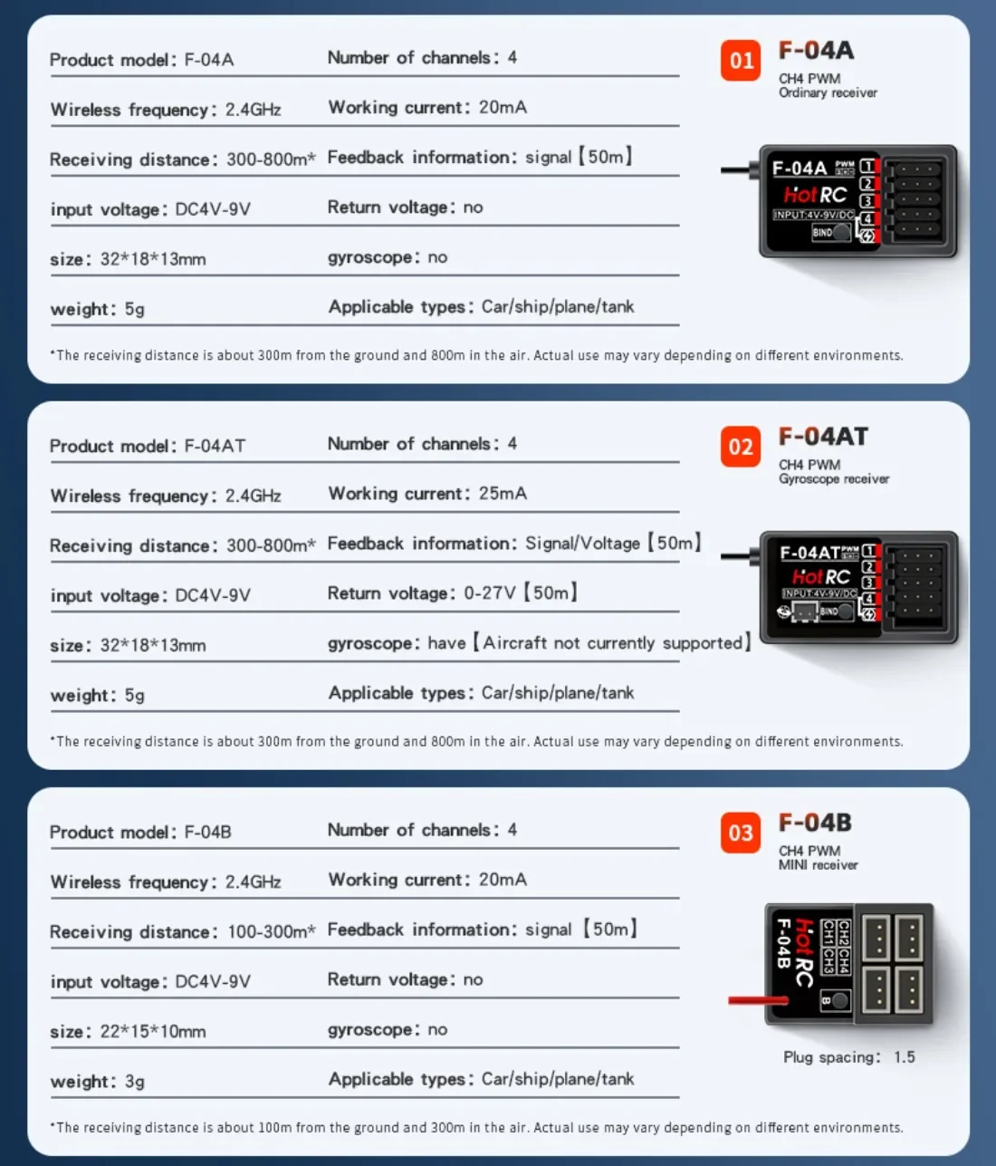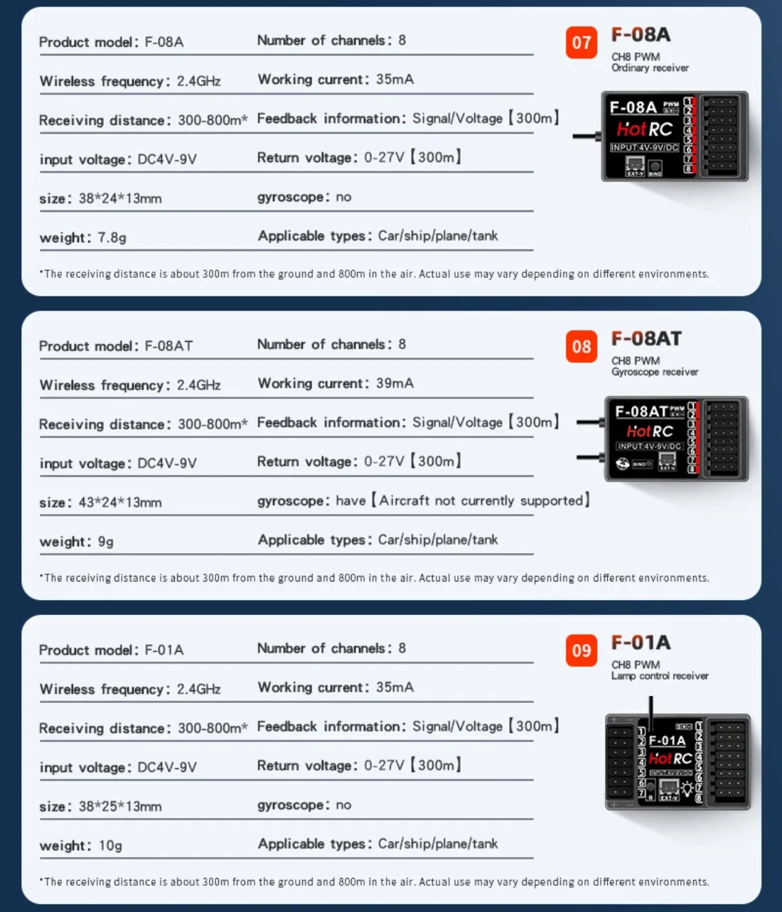 2. F-04AT, F-06AT, F-08AT, F-01AT receivers have built-in gyroscopes to ensure that the model moves in a straight line and prevent tail swinging and rollover. The gyroscope function does not support aircraft models ;