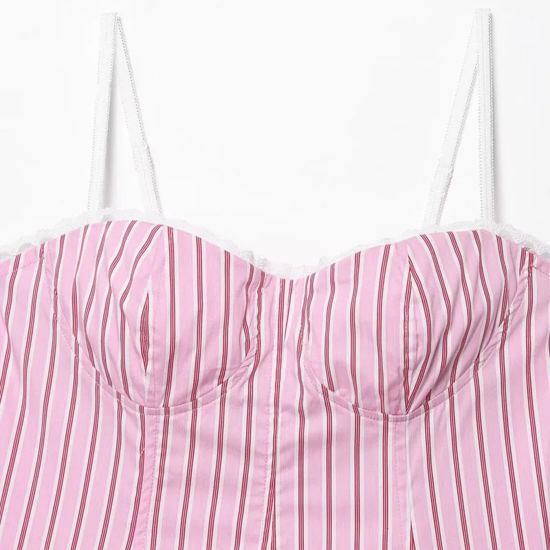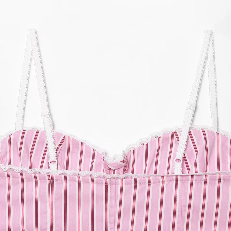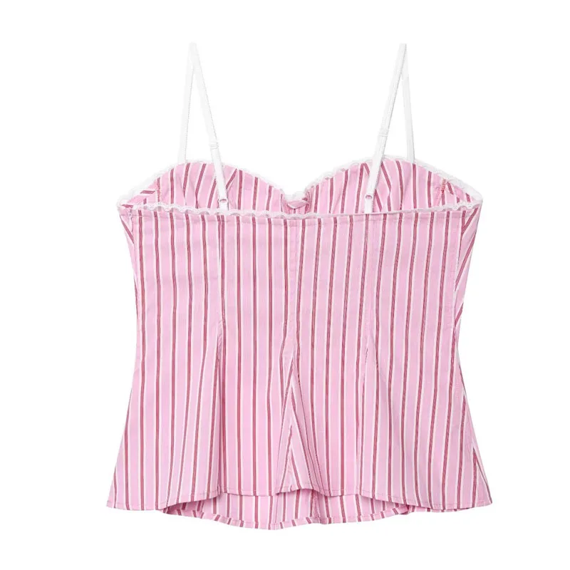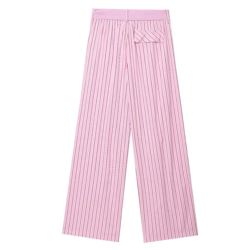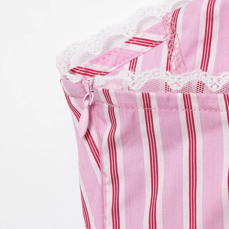 HXAO Summer Women's Two Pieces Set New Pink Striped Open Back Halter Top Pant Sets Crop Zipper Top With Lace Casual Women's Suit