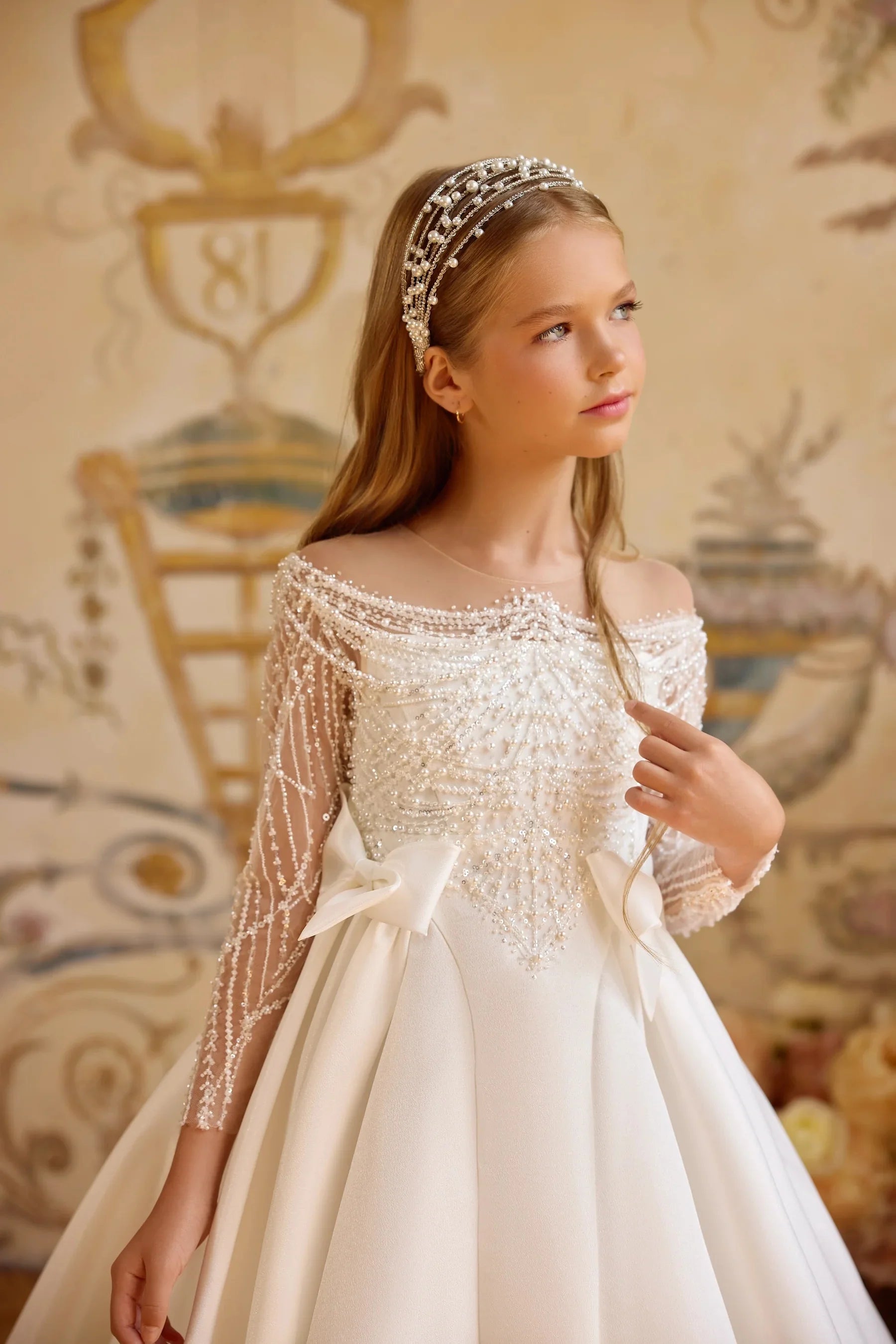 Luxury Pearls Beading Flower Girl's Dresses for Wedding White Ball Gown First Communion Dress Baby Girl Birthday Party Gowns