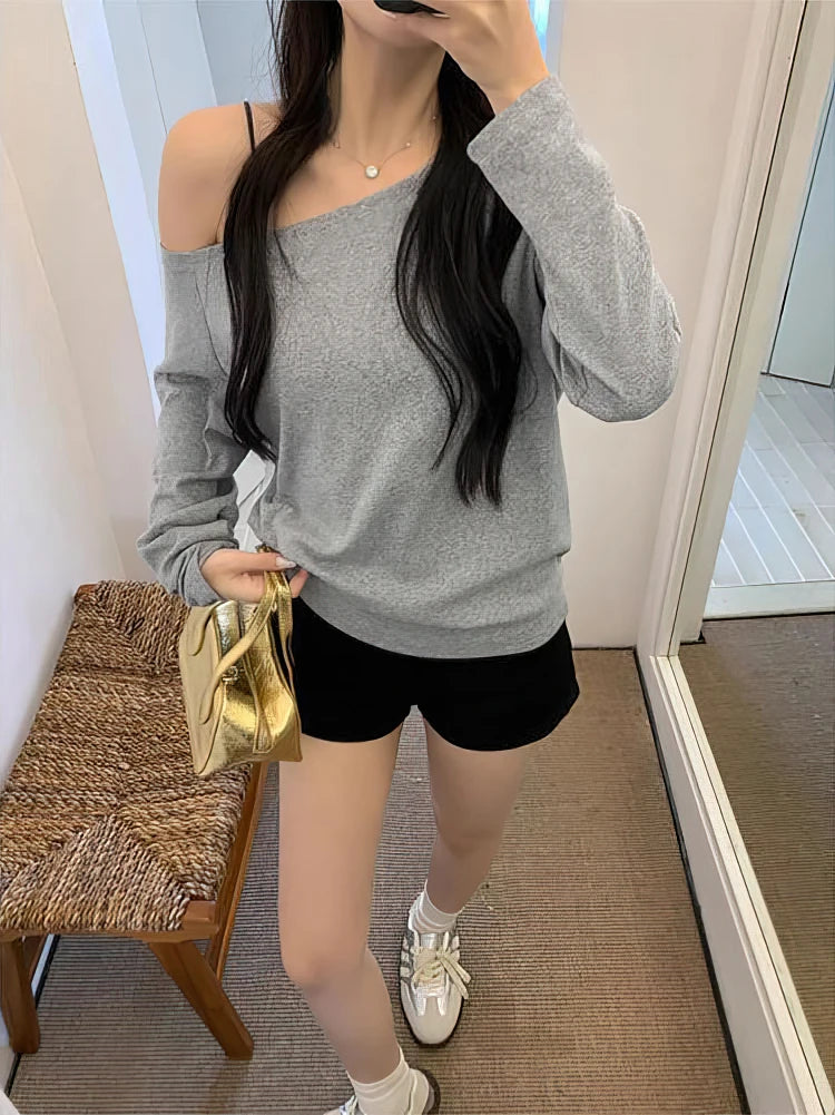Off the shoulder Long sleeve T shirt Women Spring Autumn Loose Sexy One Shoulder Top Lady Casual Basic Tees School Preppy Blouse