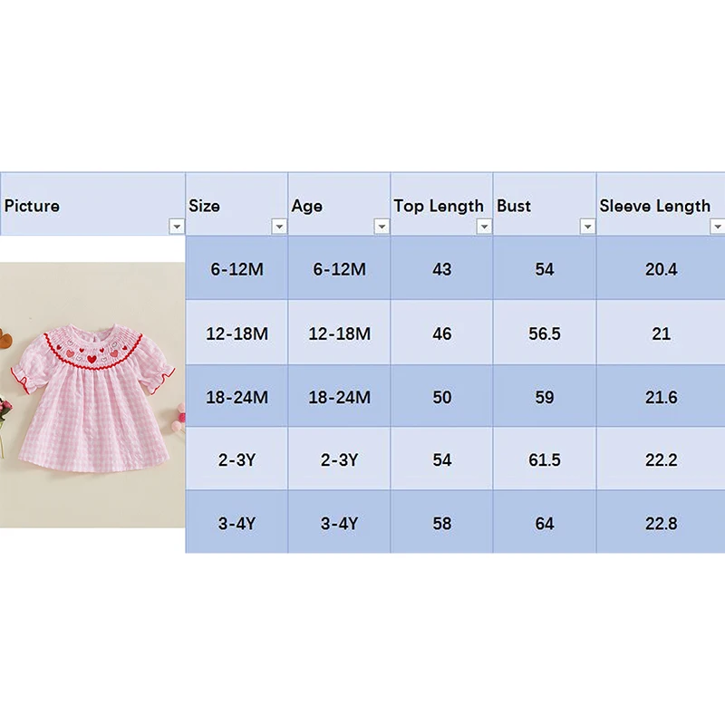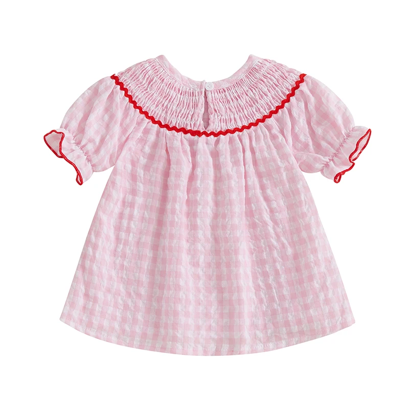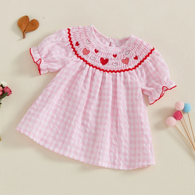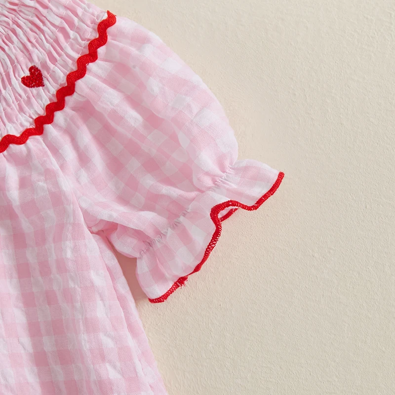 Toddler Baby Girl Valentines Day Outfit Ruffle Smocked Heart Embroidery Dress Plaid Playwear Summer Outfit 6M-4T