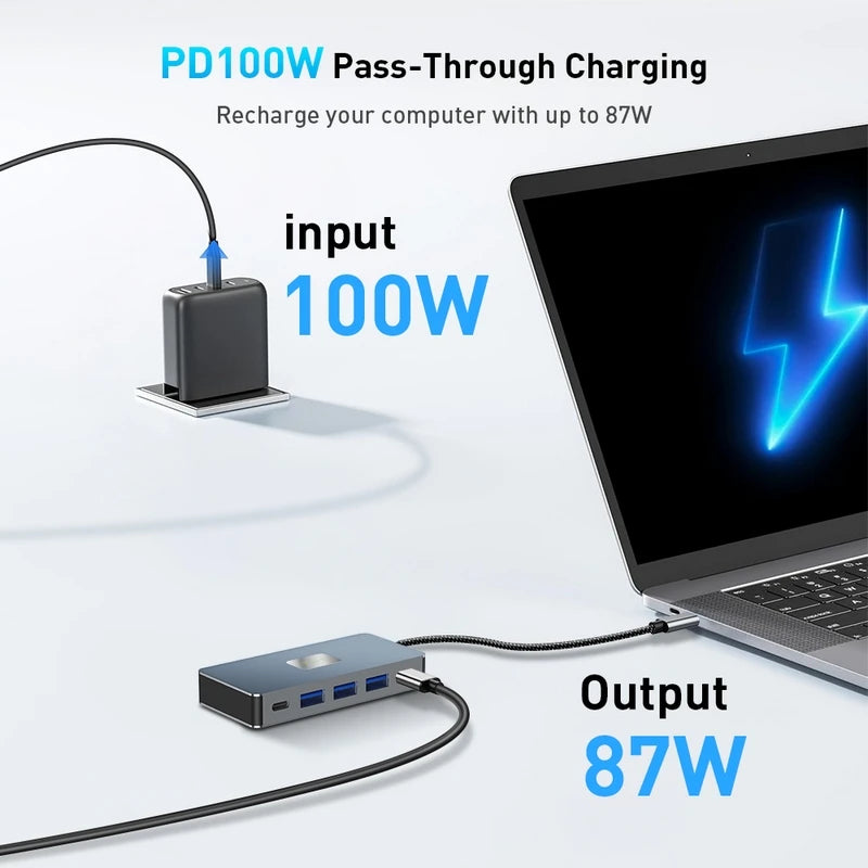 The hub supports 100W USB-C Power Delivery charging, keeping your USB-C devices powered up while using other functions without worrying about battery drain. (Note: The PD port does not support data transfer; please use the other USB-C data port for file transfers.)