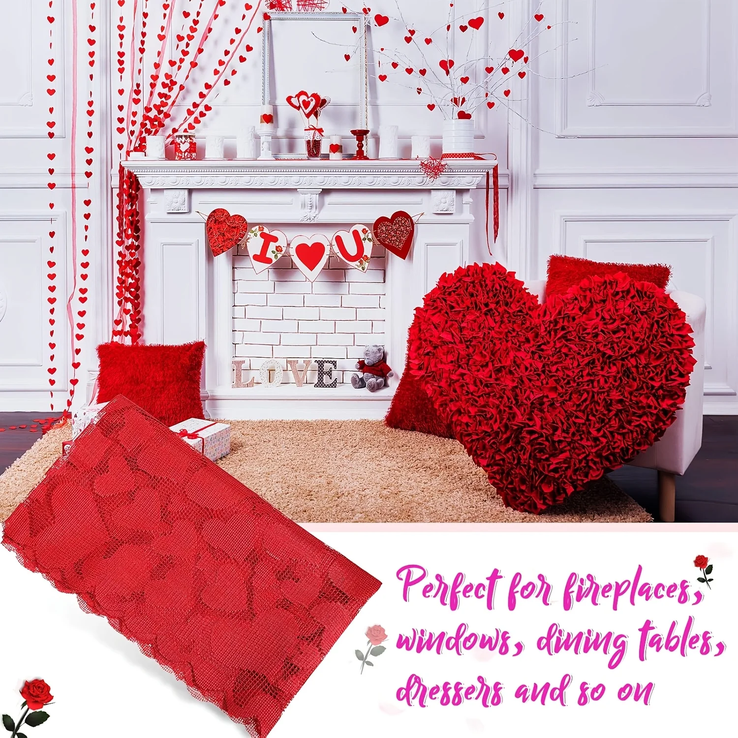 [Valentine's Day] 1 Valentine's Day Red Heart Lace Table Runner | No Assembly Required, Home Dining Table Decoration
