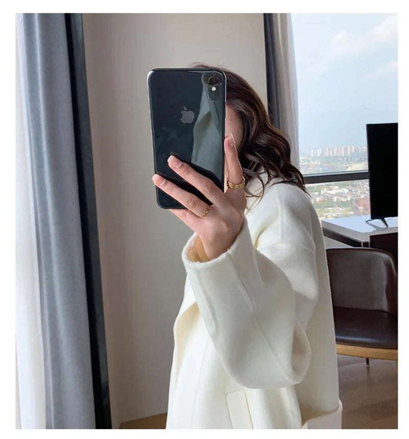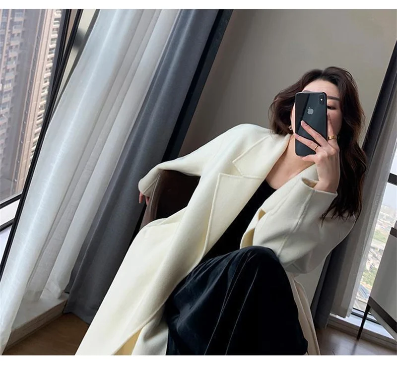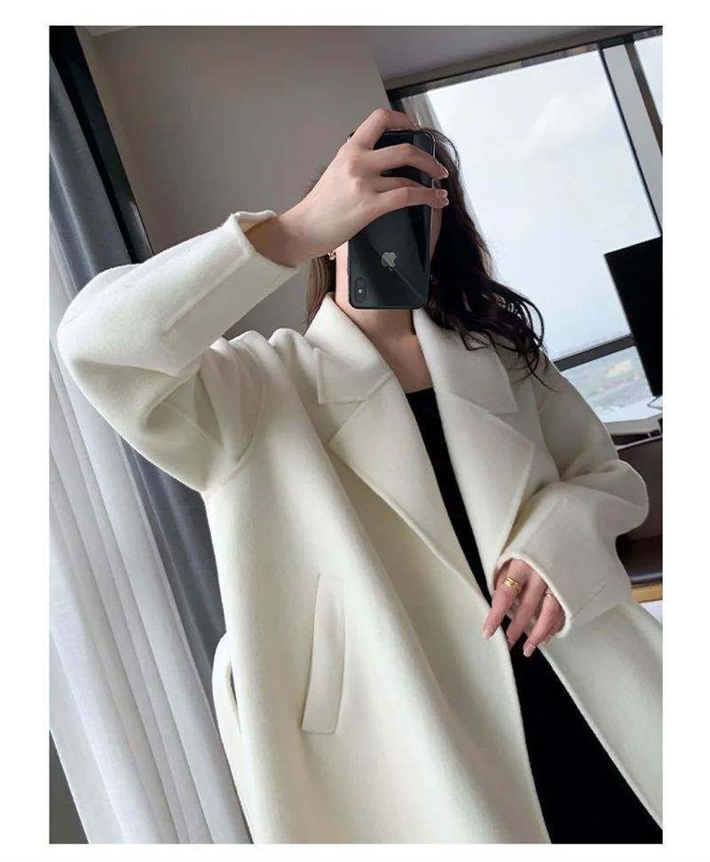 White Woolen Coat Women Autumn And Winter High-End Fashion Temperament Long Thick Blended Wool Windbreaker Female Jacket Belt 99