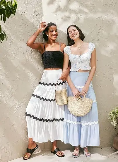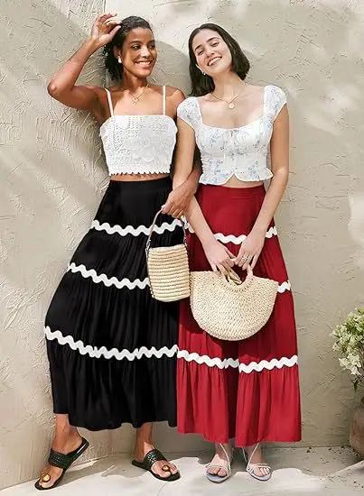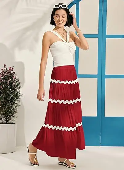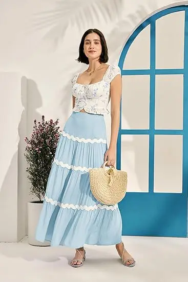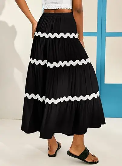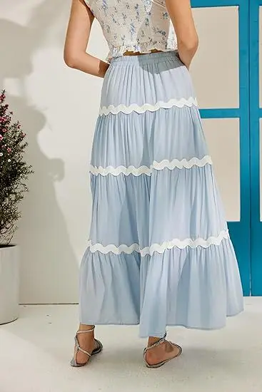 Women Dress Fashion Summer Women's Boho Elastic Waist A-line Skirt Fleece Frizzy Skirt Hem Layer Women's Vacation Outdoor Skirt