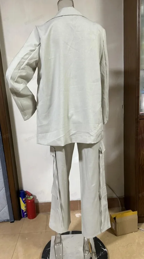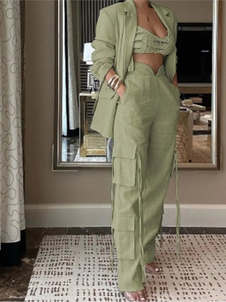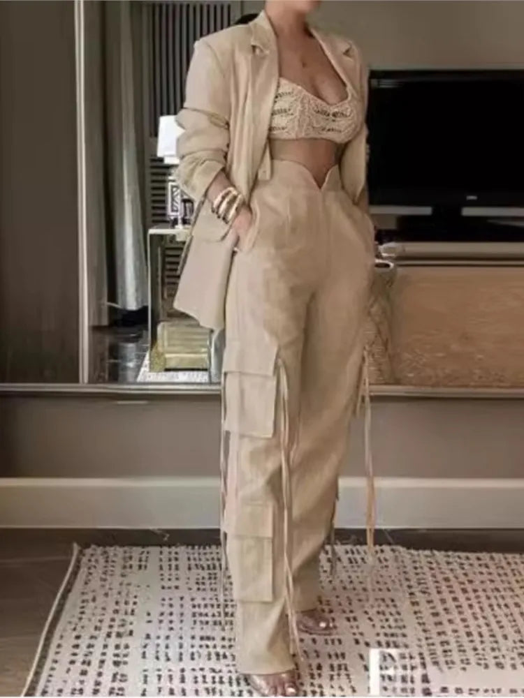 Women Fashion 2pcs Sets Spring Autumn Lapel Long Sleeve Blazer Jacket High Waist Pockets Long Pants Solid Color Office Lady Suit