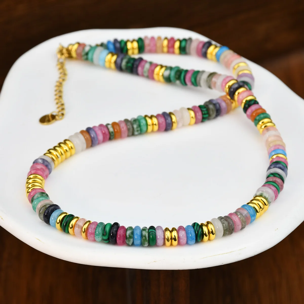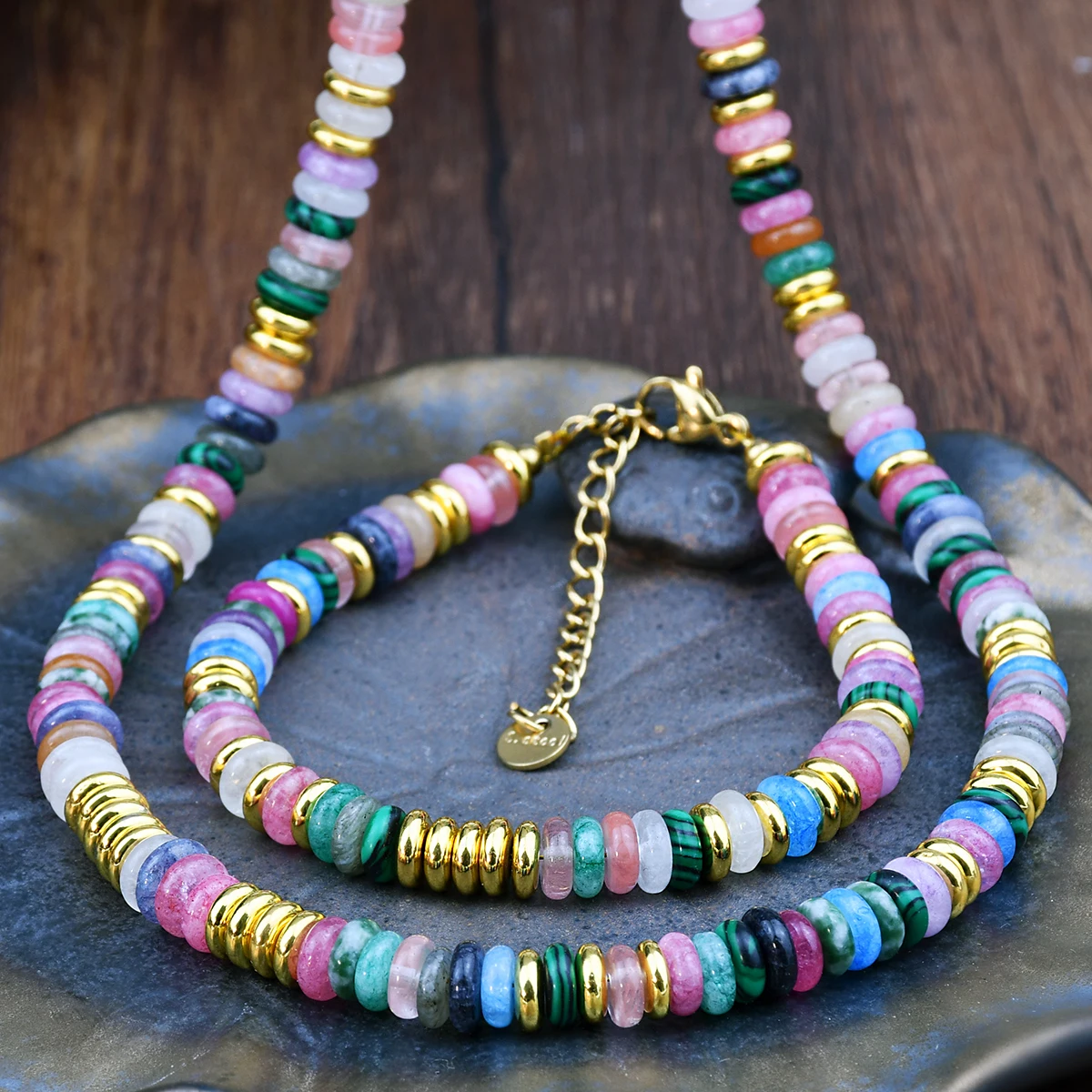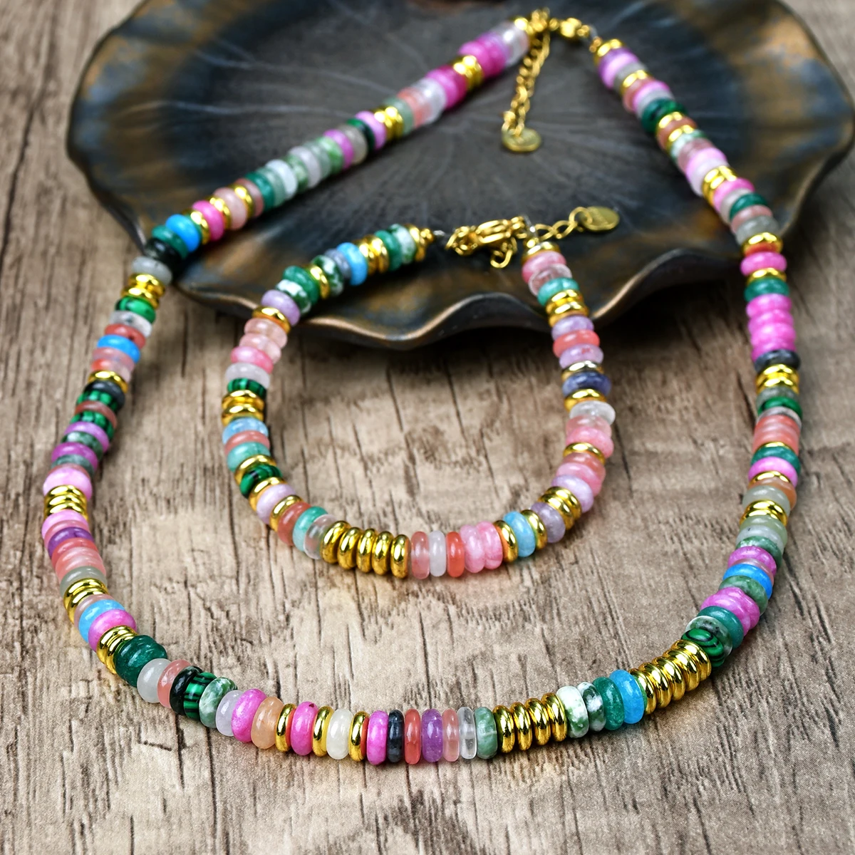 Bohemian Colorful Gemstones with Fashion Golden Spacer Beads Women Necklace Bracelet Set
